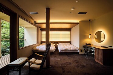 Luxurious guestrooms feature spring water bathtubs for ultimate relaxation. In-room massages elevate the tranquil ryokan experience.