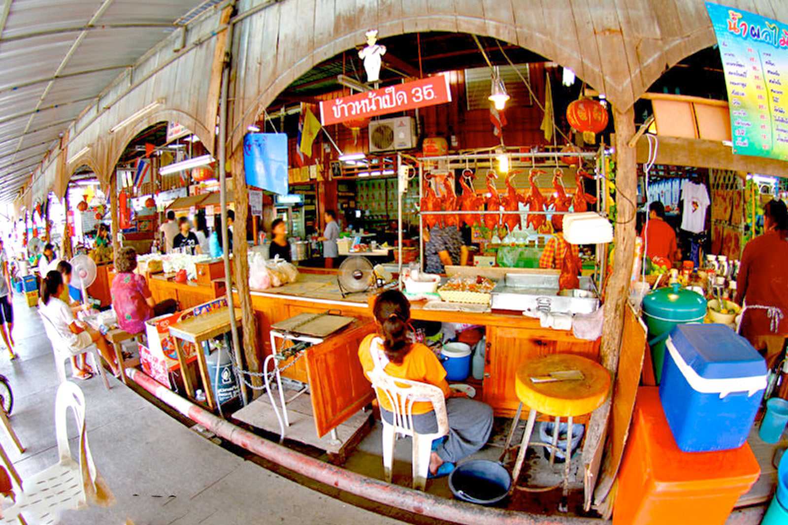 A great way to enjoy the market is the way Thai people do it – by snacking on the many food options sold along the way. Some might look familiar but it's always a lot more fun to try the unusual-looking ones until the time has come to sit down for a real lunch. Try duck noodle soup from a store in the middle part of the market. It's quite talked about on Thai forums and you can't miss it, with the roasted birds hanging at the shopfront.