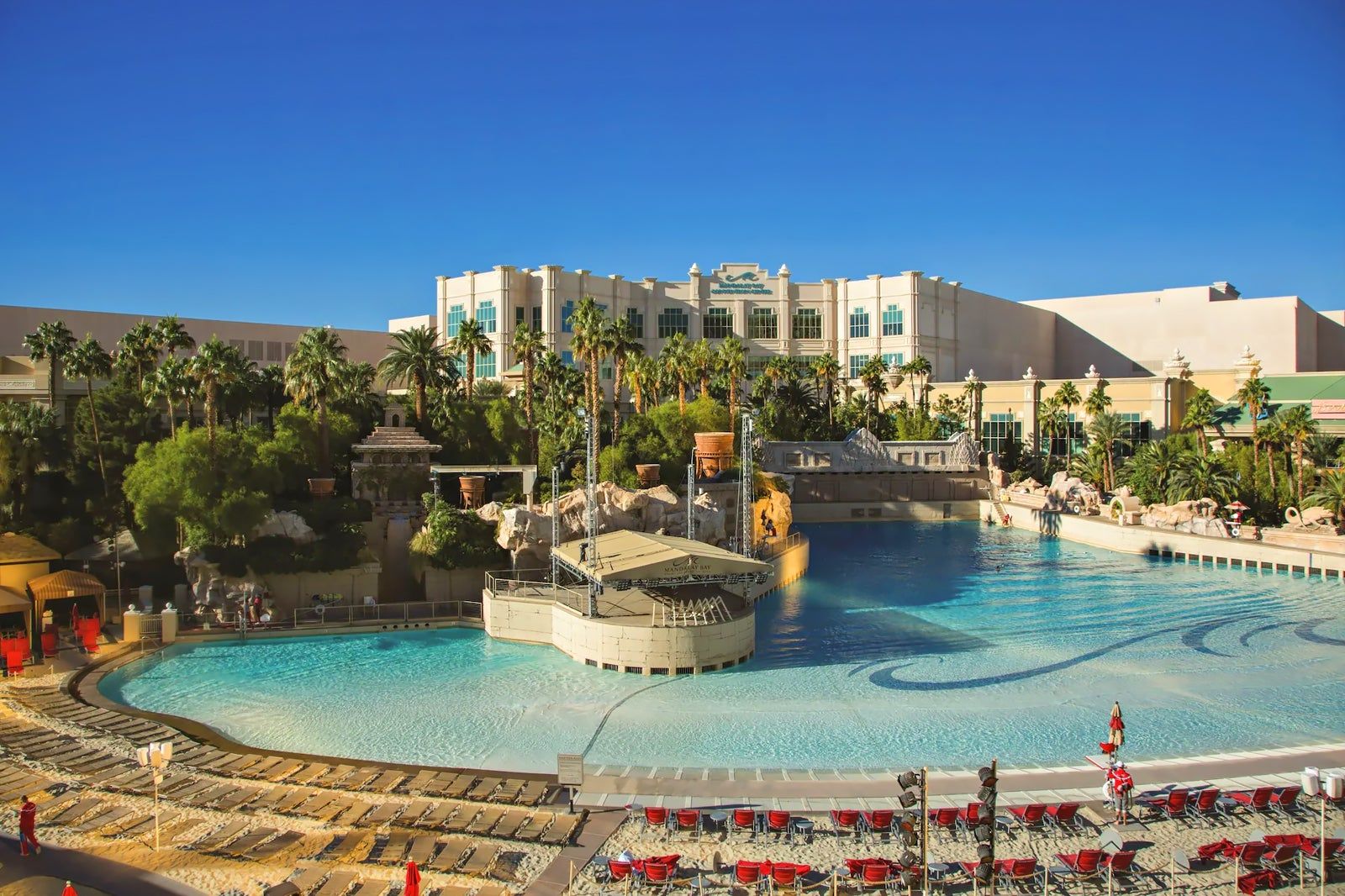 Mandalay Beach is an 11-acre swimming pool area that features 3 heated swimming pools, a wave pool, a children’s pool, and a lazy river with a waterfall. One pool, set off from the others by smoked-glass barricades, allows for topless swimming. You can also visit the Shark Reef Aquarium, one of the largest walk-through tunnel saltwater aquariums in North America. A shopping centre and 24 restaurants round out the experience.