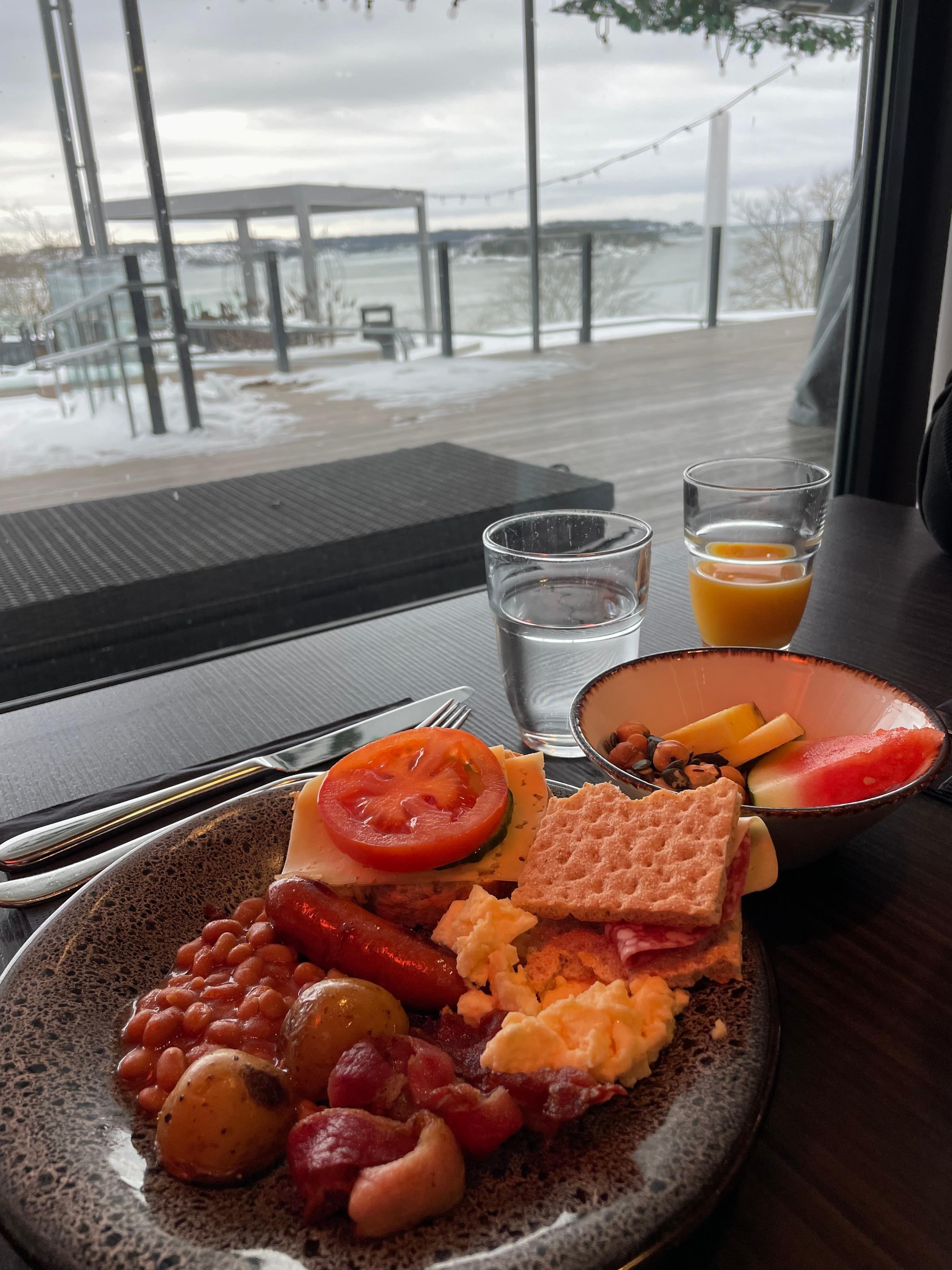 Bra men den berømte frokosten var ikke så bra denne gangen , har vært der flere ganger med fantastisk frokost Det var lite brød, det kom varme rundstykker , men de var frosne inni ellers lite pålegg , det ble ikke fylt opp . Mistenker at det var for lite folk på jobb .