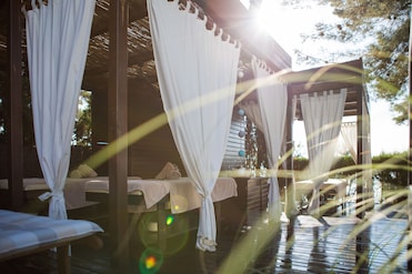 El spa del hotel frente al mar ofrece zonas de tratamiento al aire libre, masajes y servicios corporales. Una sauna, una sala de vapor y un jardín completan este santuario del bienestar.