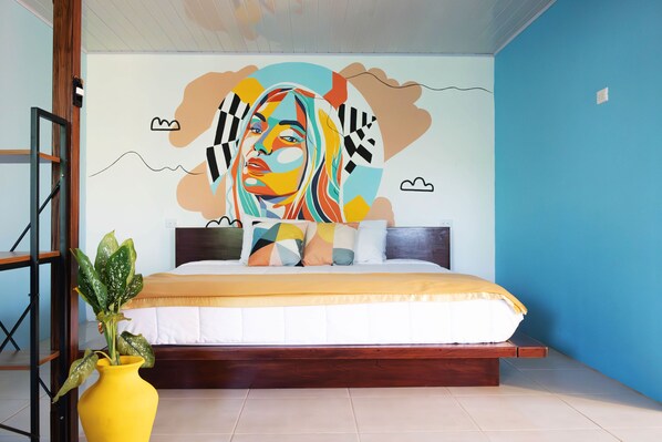 Before you book there, you have to be aware that you have to pass through the yard of charming people to get to the room, but they have a big dog (German Shepherd) that greets you with much enthusiasm by jumping on you and playfully trying to bite your arms…Not the best experience, even if you love dogs… They do their best to hold him when they hear you, but when they don’t, it can be scary… The room itself is large and airy, the king size bed is very comfortable, it is super clean, but the kitchen lacks what you would need to cook properly. There is a fridge, a microwave, a sink, a coffee machine, basic cutlery with glasses, mugs, plates, but nothing to cook on. So just ok for simple breakfasts (no toaster). You also have to know that there is NO hot water, neither in the shower nor in the sink to wash dishes. It is very well located if don’t have a car and want to be at a walking distance to town. And they have a beautiful unobstructed view of the volcano !