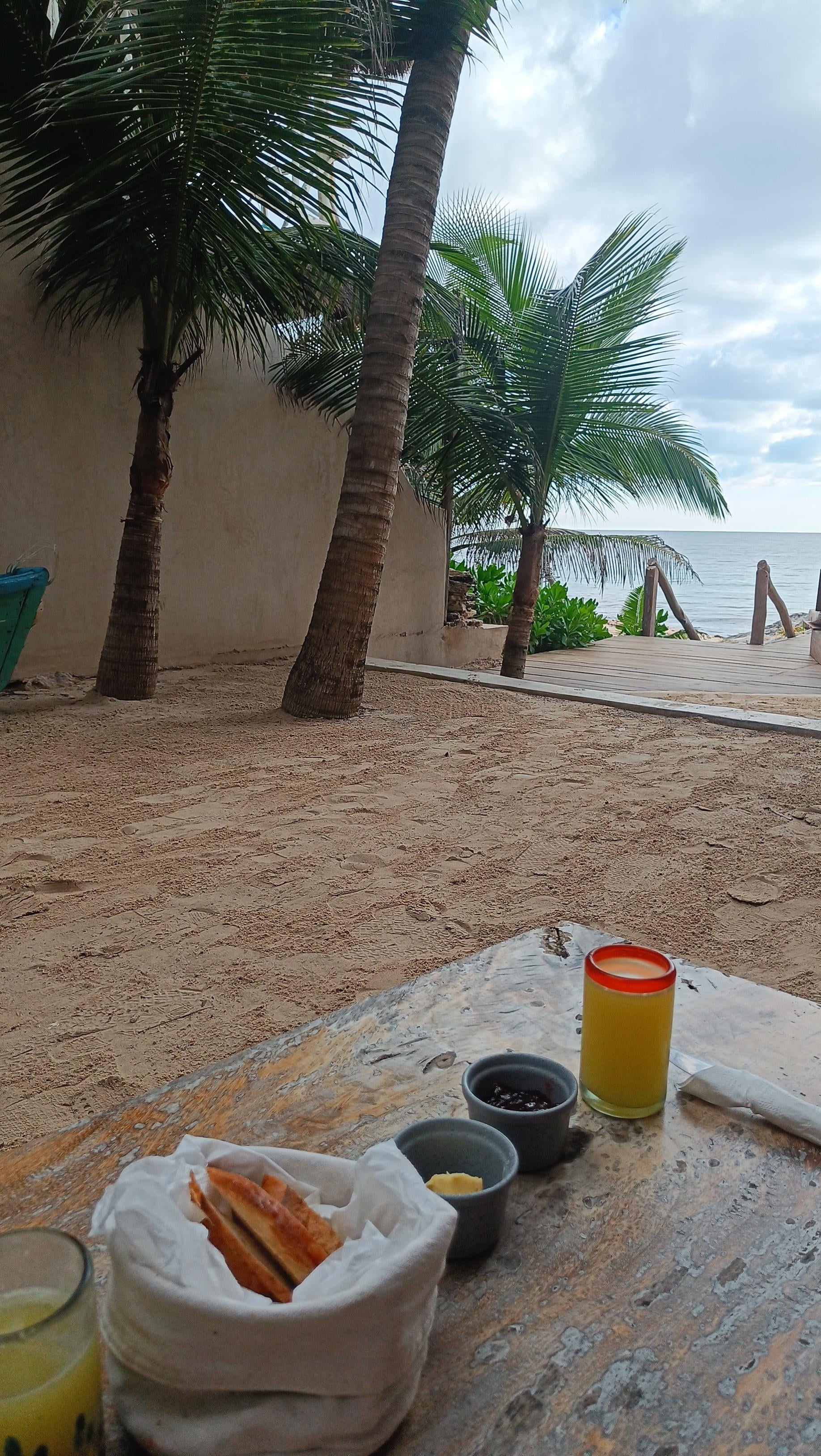 I enjoyed my stay here. I was able to park in designated spots directly across the street from the hotel. The room was right on the beach with our own patio at the door with an outdoor lounging BED! I stayed in the coral room and would definitely stay there again. We ate at the restaurants situated on both sides of the hotel and there is a pizza place across the street, all within a minute of the hotel. The other reviews about the breakfast being light were accurate but it was included and fine for me-everything was prepared fresh and delicious. I was out adventuring through Tulum during the day but upon returning to the hotel each night we turned on the ac and got the room to a cool (not cold) temp that was comfortable for sleeping. We always felt safe. Unfortunately, the beach and water was covered in seaweed, so we did not get in the water (although some people did) but I laid in the sun on the beach and our patio. Staff was attentive and helpful. The first night, I found the bed a little firm for my taste and requested extra pillows that were waiting for me when I got back. I am grateful for the wonderful experience, —off the beaten path in a space with such unique architecture and design that felt exotic, private and truly special.