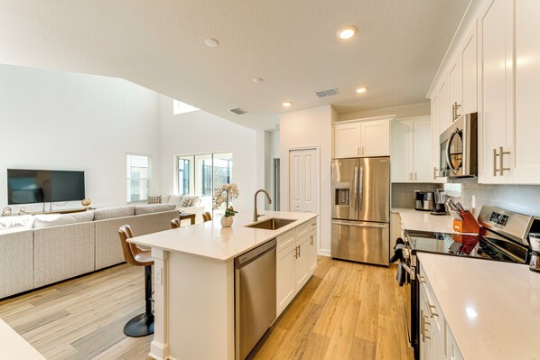 Si te hospedas en 15 Min to Disney: Sleeps 19 w/ Pool + More, estarás a tan solo 10 minutos en auto de Campo de golf Reunion Resort Golf Course y de Club de golf ChampionsGate. Las unidades incluyen detalles increíbles, como secadoras y microondas.