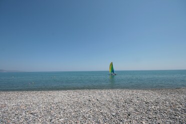 The hotel sits right on the bay with a sandy beach. Beach umbrellas and loungers await, with windsurfing adventures available nearby.